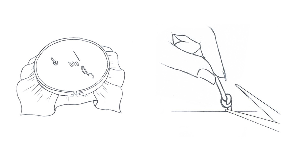 The pattern you are embroidering should be in the center of the hoop so that you can slide the thread under your thumb at all times.
