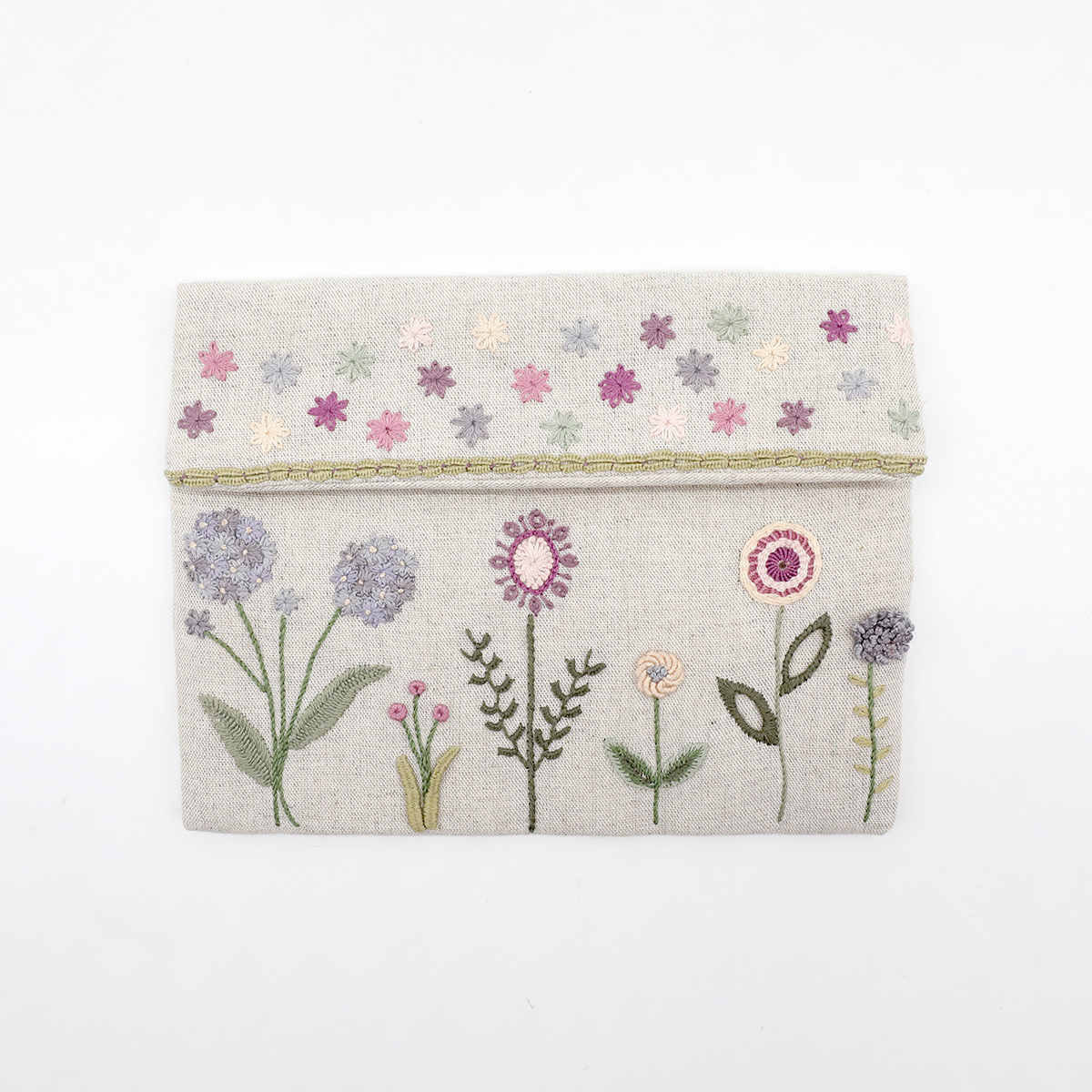 Projet 2 - Pochette mauve : bouclette de remplissage, chaînette festonnée, chaînette torse, chausson sur un fil, crétois, épine festonné, noué en relief, picot reprisé fixé, pistil, poste en fleurs, rosette.